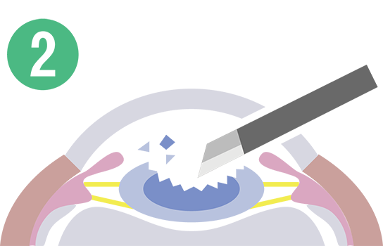 白内障手術とは、濁ってしまった水晶体の核を超音波で細かく砕いて取り除き、眼内レンズ(人工レンズ)を挿入することです。