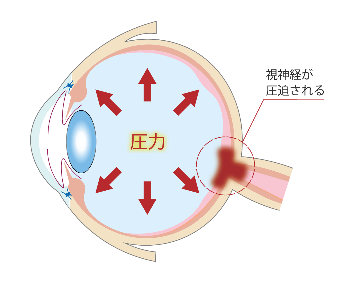 緑内障は、何らかの原因によって眼圧(眼の内側から外側にかかる圧力)が高くなり、視神経が痛むことで、視野が欠けたり徐々に狭くなったりする目の疾患です。緑内障は、ゆっくりと進行することが多く、初期の段階では自覚症状がほとんどなく、進行してから気づくことが多いです。