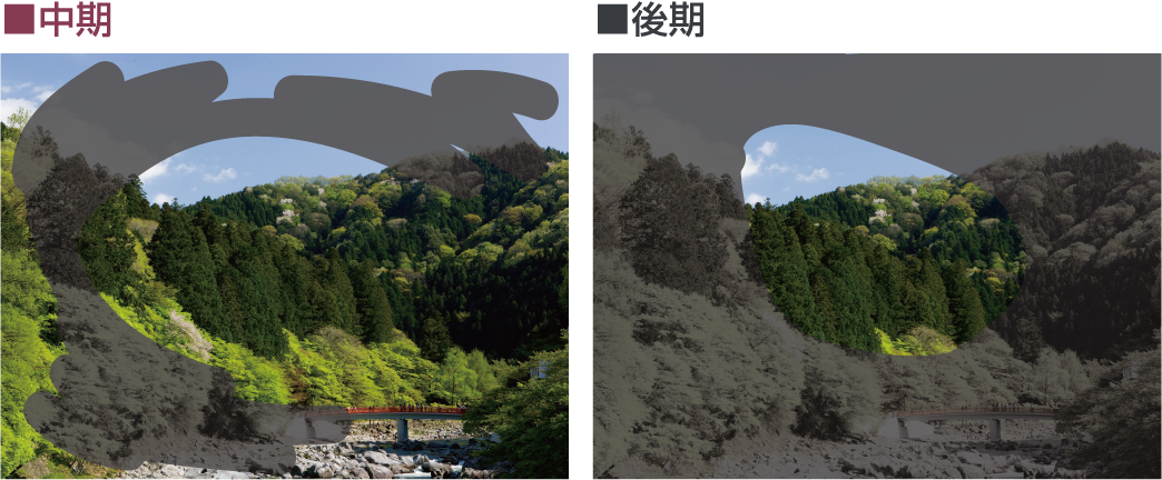 中期の段階まで症状が進行しますと、視野の欠けている部分が少しずつ増えてきます。視力の低下やボンヤリ感、夜になると見えにくくなるなどの症状があらわれてきます。